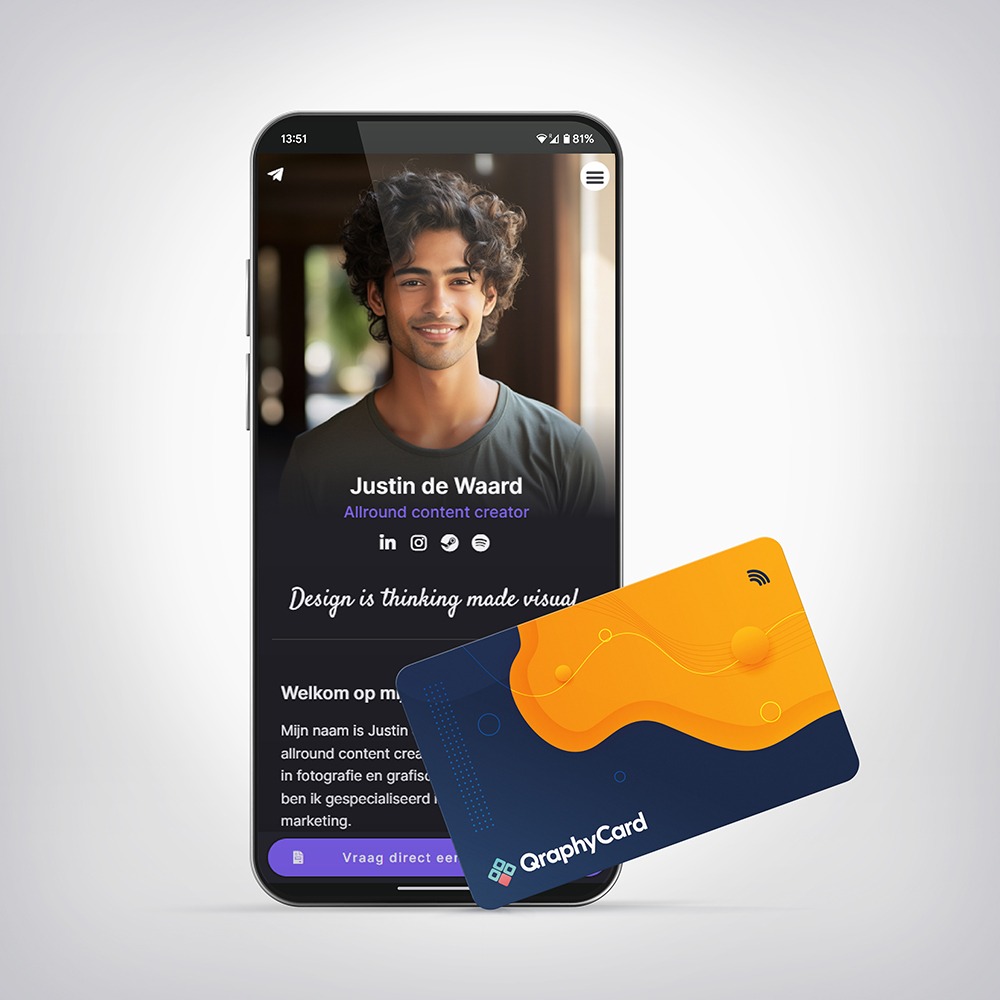 De NFC Visitekaartjes van Qraphy Card geven jou de mogelijkheid om je contactgegevens simpel en snel te delen met anderen door de telefoon bij het kaartje te houden of door de QR-Code te scannen. De gegevens worden via de browser binnengehaald en met een klik worden opgeslagen in de contacten.