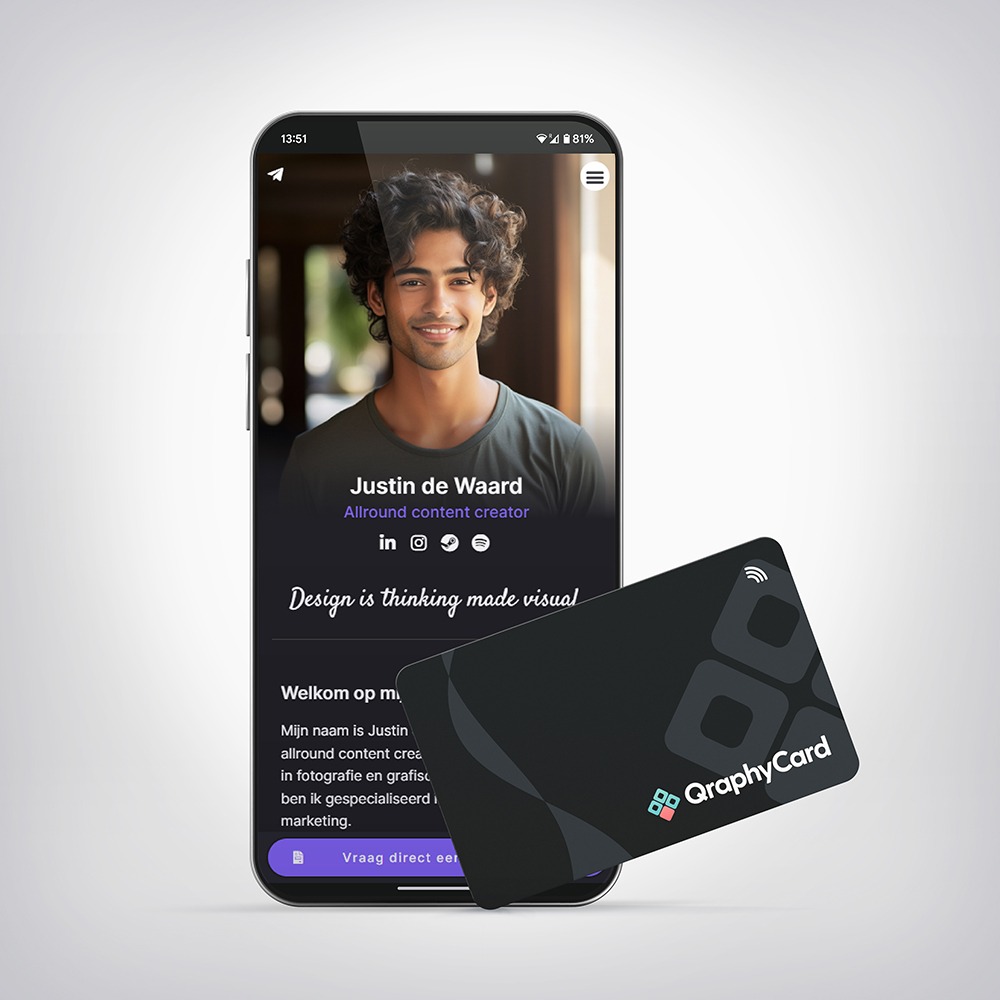 De NFC Visitekaartjes van Qraphy Card geven jou de mogelijkheid om je contactgegevens simpel en snel te delen met anderen door de telefoon bij het kaartje te houden of door de QR-Code te scannen. De gegevens worden via de browser binnengehaald en met een klik worden opgeslagen in de contacten.
